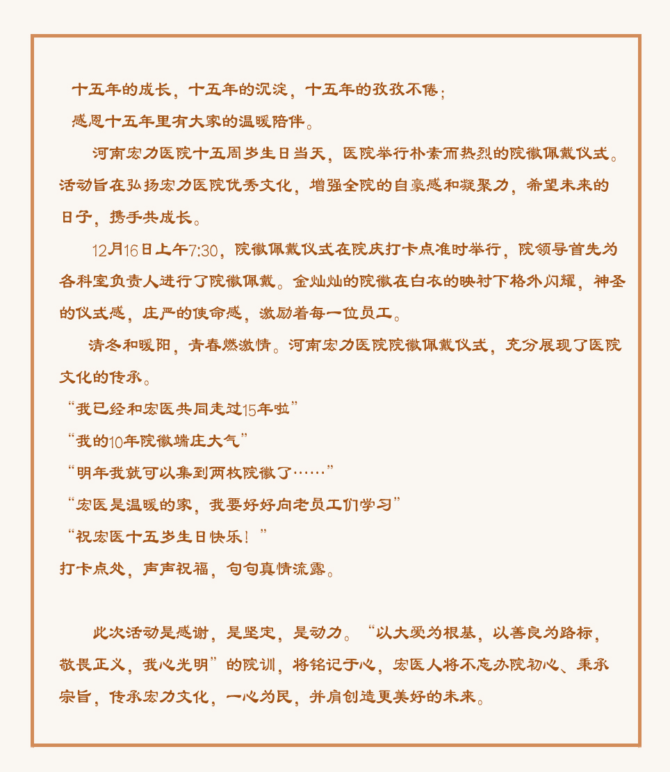 河南宏力醫(yī)院十五周歲院慶系列活動——院徽佩戴儀式